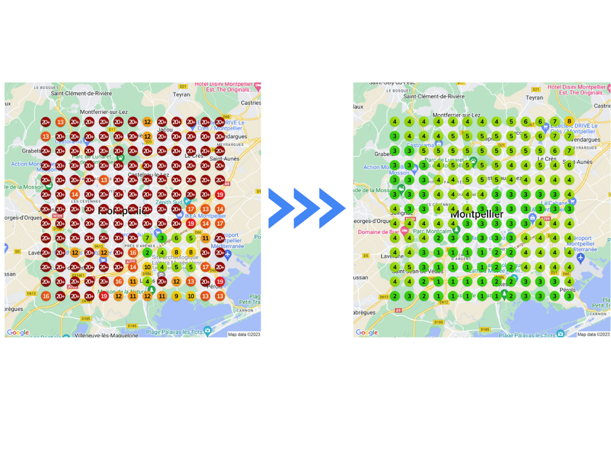 Les numéros représentent votre position sur Google en fonction de la zone à laquelle une recherche est faite. Plus votre page sera bien référencée, plus vous serez visible sur des zones éloignées de votre établissement.